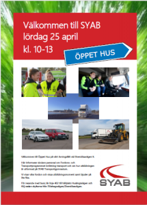 Välkommen till Öppet hus på SYAB Transportgymnasium lördagen den 25 april kl. 10-13. Vi finns på vårt övningsfält (vid Elverslösavägen 9), där vi informerar om skolan och Fordons- och transportprogrammet inriktning transport. Vi visar även våra fordon och vissa utbildningsmoment samt bjuder på lite fika. Klicka på bilden nedan för mer information.